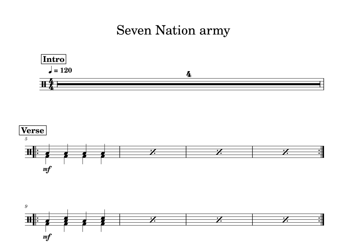 《Seven Nation army》是白色条纹乐队演唱的一首歌曲,拍号为4/4拍,歌曲速度为每分钟120拍,这份鼓谱共有一张高清图谱,图谱由 @打鼓谱 编配上传,图谱使用五线谱编配,使用这份Seven Nation army架子鼓谱,你将能够轻松地敲打出这首白色条纹乐队的Seven Nation army,快来尝试吧。《Seven Nation Army》是白色条纹乐队最著名的摇滚单曲,于2003.03.12 发行。这首歌是NBA迈阿密热火队主场主队球员介绍时的背景乐,拜仁慕尼黑,马德里竞技和上海申花队在取得主场进球时播放的音乐也来自此曲。 技巧难点 本曲速度为120,较快的速度。 本曲的贝斯演奏是亮点;主歌部分贝斯鼓与三通演奏四分音符,保持稳定的律动;主歌第二遍,加上二四拍军鼓;13-14小节,注意力度渐强的演奏;器乐副歌的力度是f(强),右手在Crash上演奏,加强音乐情绪;最后两小节,注意四分音符和八分音符转换。