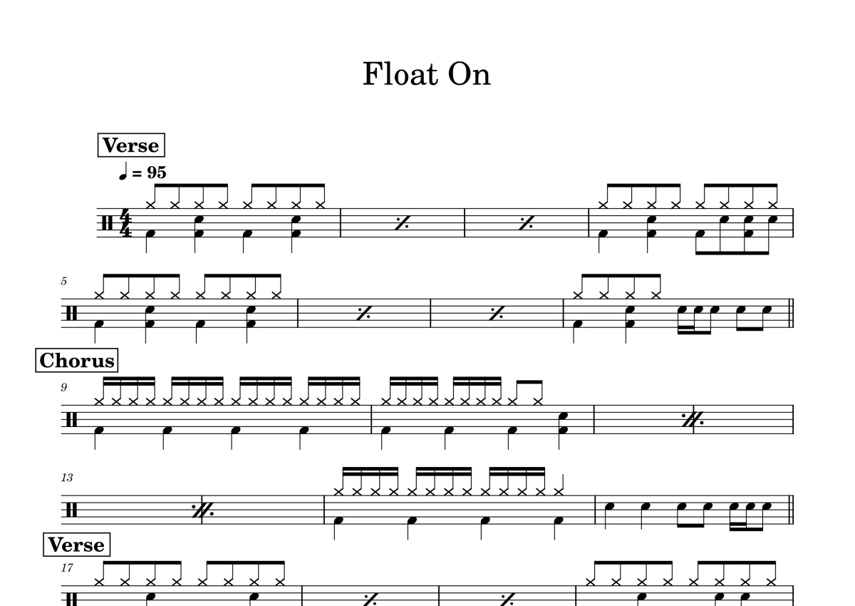 《Float On》,歌曲速度为每分钟95拍,这份鼓谱共有一张高清图谱,图谱由 @打鼓谱 编配上传,图谱使用五线谱编配,使用这份Float On架子鼓谱,你将能够轻松地敲打出这首Float On,快来尝试吧。技巧难点 本曲速度为95,最舒适的速度,独立摇滚曲风。 主歌部分为八分音符四小节乐句,注意持续每拍演奏的贝斯鼓,Drum Fill加花部分为十六分音符的各种组合,请注意时值的准确。 副歌部分为十六分音符节奏型,建议用单击的手法演奏(RLRL或LRLR),各种十六分音符组合的Drum Fill加花部分,建议唱节奏演奏,以保持准确性。