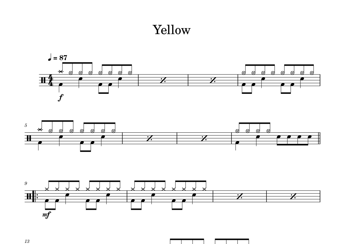 《Yellow》是Cold Play演唱的一首歌曲,拍号为4/4拍,歌曲速度为每分钟87拍,这份鼓谱共有一张高清图谱,图谱由 @打鼓谱 编配上传,图谱使用五线谱编配,使用这份Yellow架子鼓谱,你将能够轻松地敲打出这首Cold Play的Yellow,快来尝试吧。《Yellow》是英国摇滚乐队(Cold Play)酷玩乐队演唱的歌曲,由乐队四位成员克里斯·马汀、盖·贝瑞曼、强尼·邦蓝、威尔·查平共同填词,肯·尼尔森和乐队四位成员共同制作。这首歌被收录于乐队的首张专辑《Parachutes》里,并于2000年6月26日作为专辑的第二支单曲发布。 技巧难点 本曲速度为87,初学者最舒服的速度。 第一段前奏8小节,f(力度记号=强)右手在Crash演奏,配合失真的节奏吉他。 第二段主歌12小节,mf(力度记号=中强),踩镲闭镲演奏;2小节的过渡段,踩镲半开,音乐情绪渐。