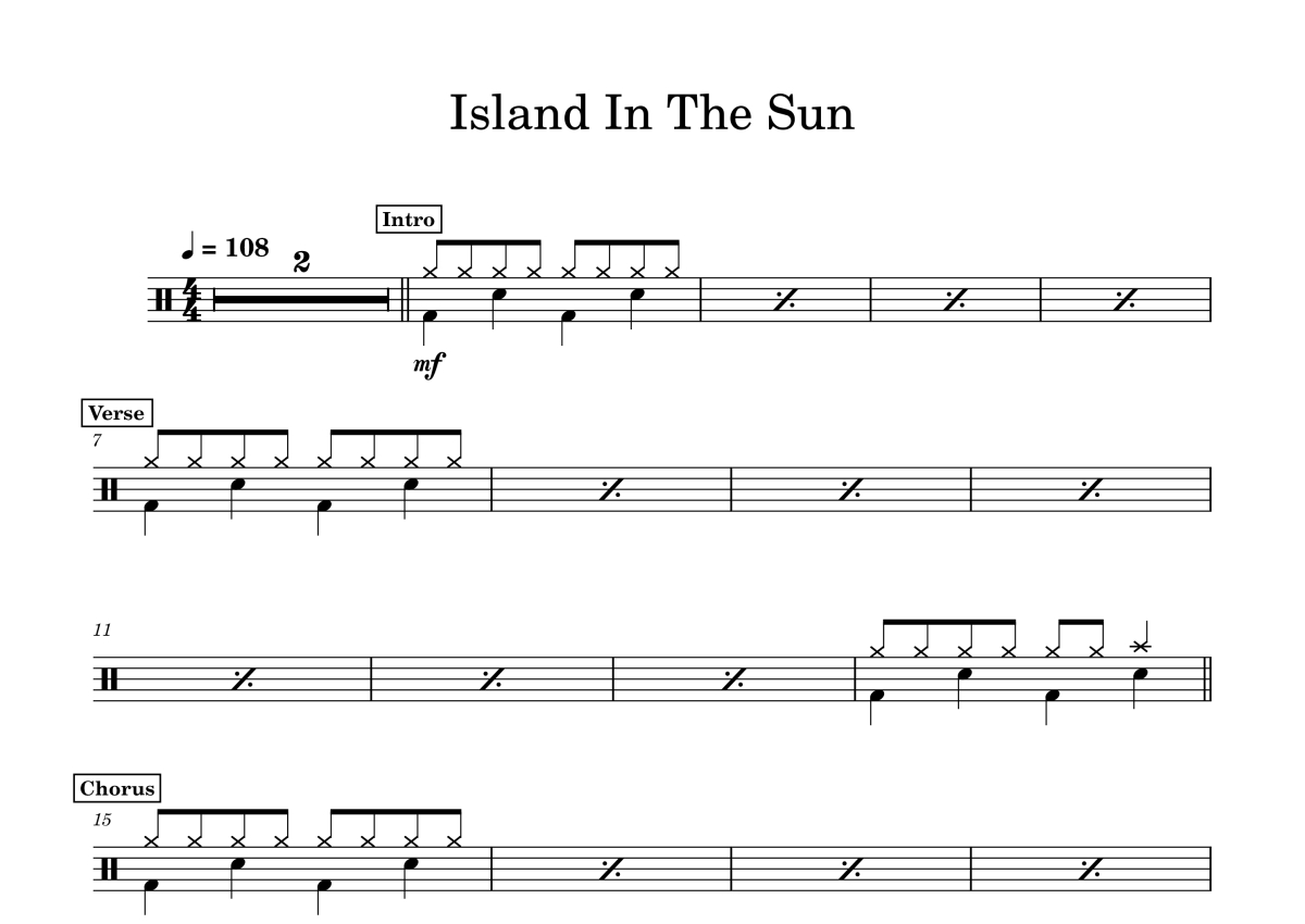 《Island In The Sun》是Weezer演唱的一首歌曲,拍号为4/4拍,歌曲速度为每分钟108拍,这份鼓谱共有一张高清图谱,图谱由 @打鼓谱 编配上传,图谱使用五线谱编配,使用这份Island In The Sun架子鼓谱,你将能够轻松地敲打出这首Weezer的Island In The Sun,快来尝试吧。《Island in the sun》是Weezer乐队的第三张专辑《Green Album》里的单曲,本歌于2001年5月发行。 技巧难点 速度为中速的108,初学者最舒服的速度。 前奏:为各声部渐进式,两小节吉他后进鼓,鼓手演奏两小节后进贝斯。 主歌:万能的动次打次,在踩镲上演奏,第8小节Drum Fill。(加花部分可以尝试拓展) 副歌:万能的动次打次,在Ride上演奏,第8小节Drum Fill。(加花部分可以尝试拓展) 过渡段:万能的动打动打,f(力度=强),Crash四分节奏型,第8小节Dru。