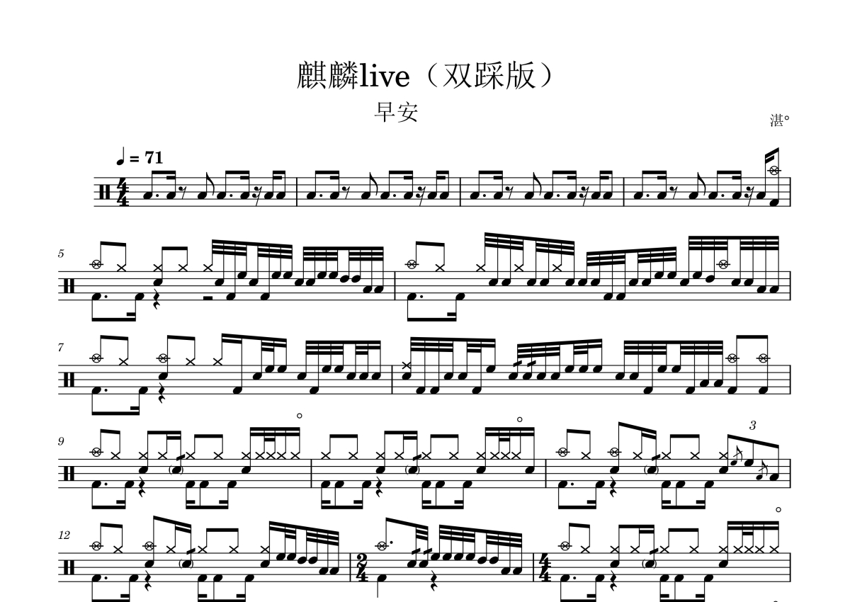 早安《麒麟live》鼓谱 - 架子鼓谱 - 双踩版
