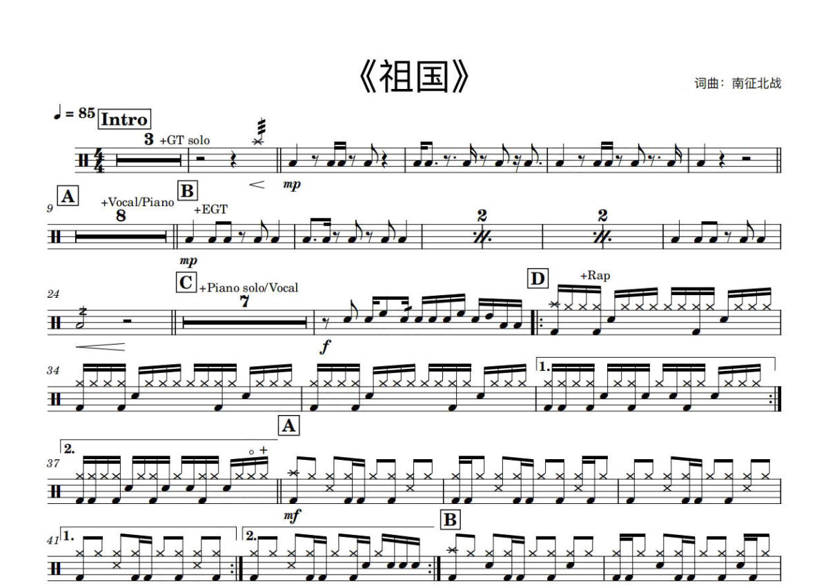 《祖国》是南征北战演唱的一首歌曲,拍号为4/4拍,歌曲速度为每分钟85拍,这份鼓谱共有一张高清图谱,图谱由 @打鼓谱 编配上传,图谱使用五线谱编配,使用这份祖国架子鼓谱,你将能够轻松地敲打出这首南征北战的祖国,快来尝试吧。录音版的曲式 。律动和加花有所简化。