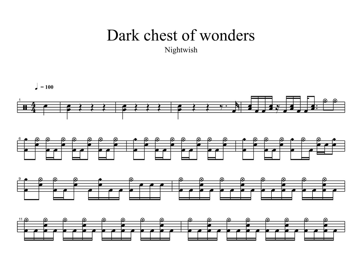 《Dark Chest Of Wonder》是夜愿演唱的一首歌曲,拍号为4/4拍,歌曲速度为每分钟100拍,这份鼓谱共有四张高清图谱,图谱由 @打鼓谱 编配上传,图谱使用五线谱编配,使用这份Dark Chest Of Wonder架子鼓谱,你将能够轻松地敲打出这首夜愿的Dark Chest Of Wonder,快来尝试吧。《Dark Chest of Wonders》是Nightwish演唱的一首歌曲,Holopainen作词,收录于专辑《Once》。