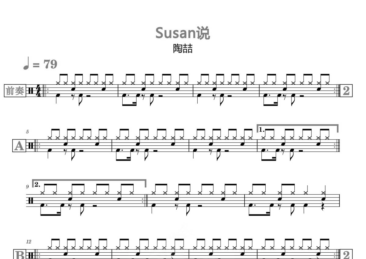 《Susan说》是陶喆演唱的一首歌曲,拍号为4/4拍,歌曲速度为每分钟79拍,这份鼓谱共有两张高清图谱,图谱由 @打鼓谱 编配上传,图谱使用五线谱编配,使用这份Susan说架子鼓谱,你将能够轻松地敲打出这首陶喆的Susan说,快来尝试吧。