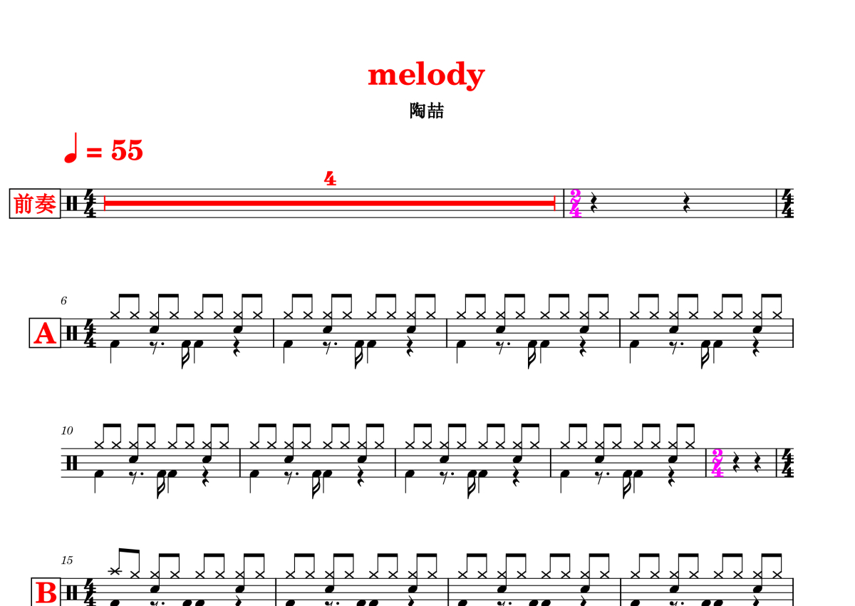 《melody》是陶喆演唱的一首歌曲,拍号为4/4拍,歌曲速度为每分钟55拍,这份鼓谱共有两张高清图谱,图谱由 @打鼓谱 编配上传,图谱使用五线谱编配,使用这份melody架子鼓谱,你将能够轻松地敲打出这首陶喆的melody,快来尝试吧。
