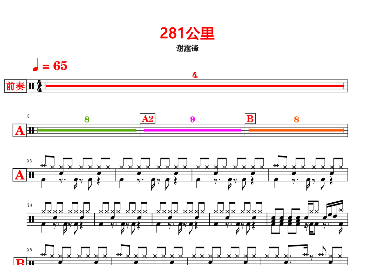 《281公里》是谢霆锋演唱的一首歌曲,拍号为4/4拍,歌曲速度为每分钟65拍,这份鼓谱共有一张高清图谱,图谱由 @打鼓谱 编配上传,图谱使用五线谱编配,使用这份281公里架子鼓谱,你将能够轻松地敲打出这首谢霆锋的281公里,快来尝试吧。
