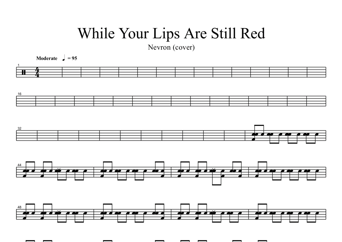 《While Your Lips Are Still Red》是Nightwish演唱的一首歌曲,拍号为4/4拍,歌曲速度为每分钟95拍,这份鼓谱共有两张高清图谱,图谱由 @打鼓谱 编配上传,图谱使用五线谱编配,使用这份While Your Lips Are Still Red架子鼓谱,你将能够轻松地敲打出这首Nightwish的While Your Lips Are Still Red,快来尝试吧。While Your Lips Are Still Red Nightwish 夜愿。