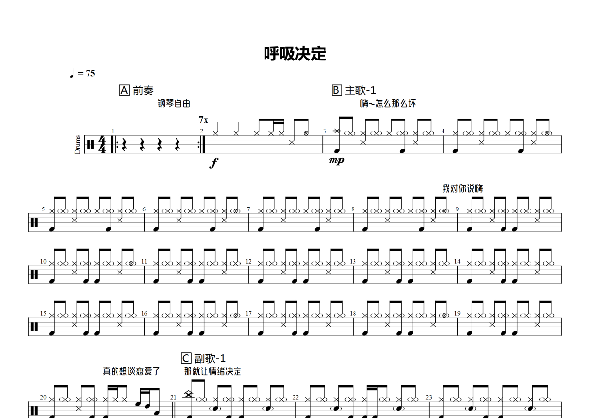 《呼吸决定》是Fine乐团演唱的一首歌曲,拍号为4/4拍,歌曲速度为每分钟75拍,这份鼓谱共有两张高清图谱,图谱由 @打鼓谱 编配上传,图谱使用五线谱编配,使用这份呼吸决定架子鼓谱,你将能够轻松地敲打出这首Fine乐团的呼吸决定,快来尝试吧。《呼吸决定》是内地流行乐独立音乐人Fine乐团演唱的歌曲,乐团由一男一女组成。歌曲由组合中的男生刘冠南作词、作曲。女生乔西负责演唱。收录在首张专辑《I’m sorry》中于2015年10月22日发行。为专辑中的代表作。