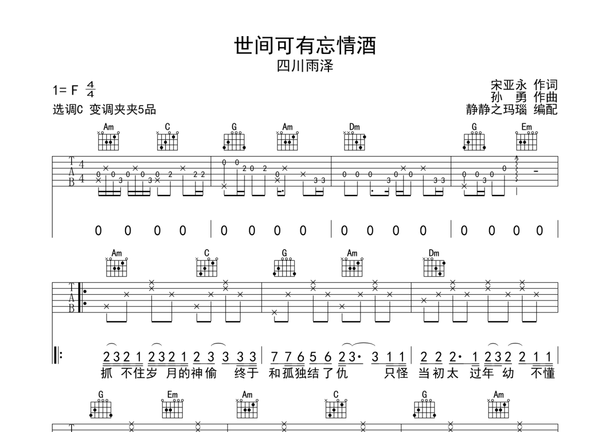 四川雨泽《世间可有忘情酒》吉他谱 - C调弹唱六线谱