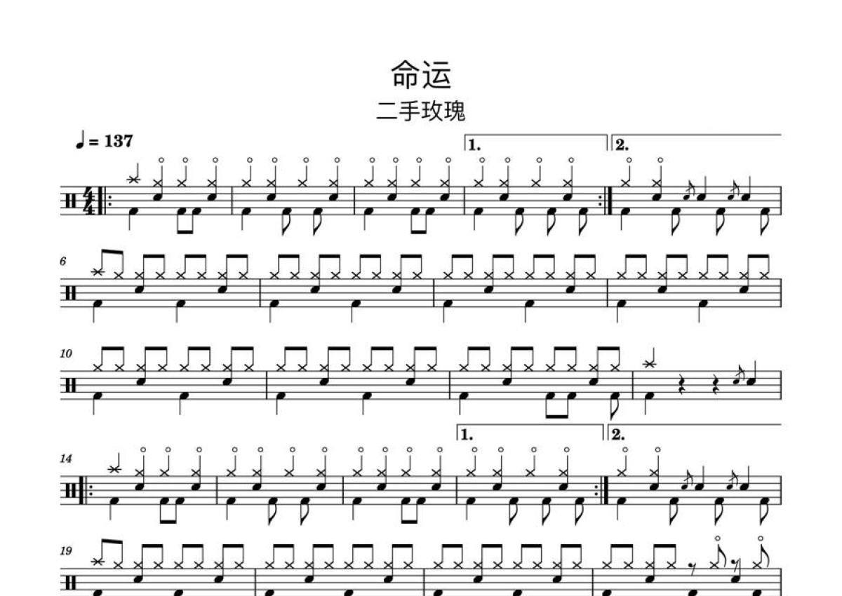 《命运》是二手玫瑰演唱的一首歌曲,拍号为4/4拍,歌曲速度为每分钟137拍,这份鼓谱共有三张高清图谱,图谱由 @打鼓谱 编配上传,图谱使用五线谱编配,使用这份命运架子鼓谱,你将能够轻松地敲打出这首二手玫瑰的命运,快来尝试吧。懒写谱的看过来。