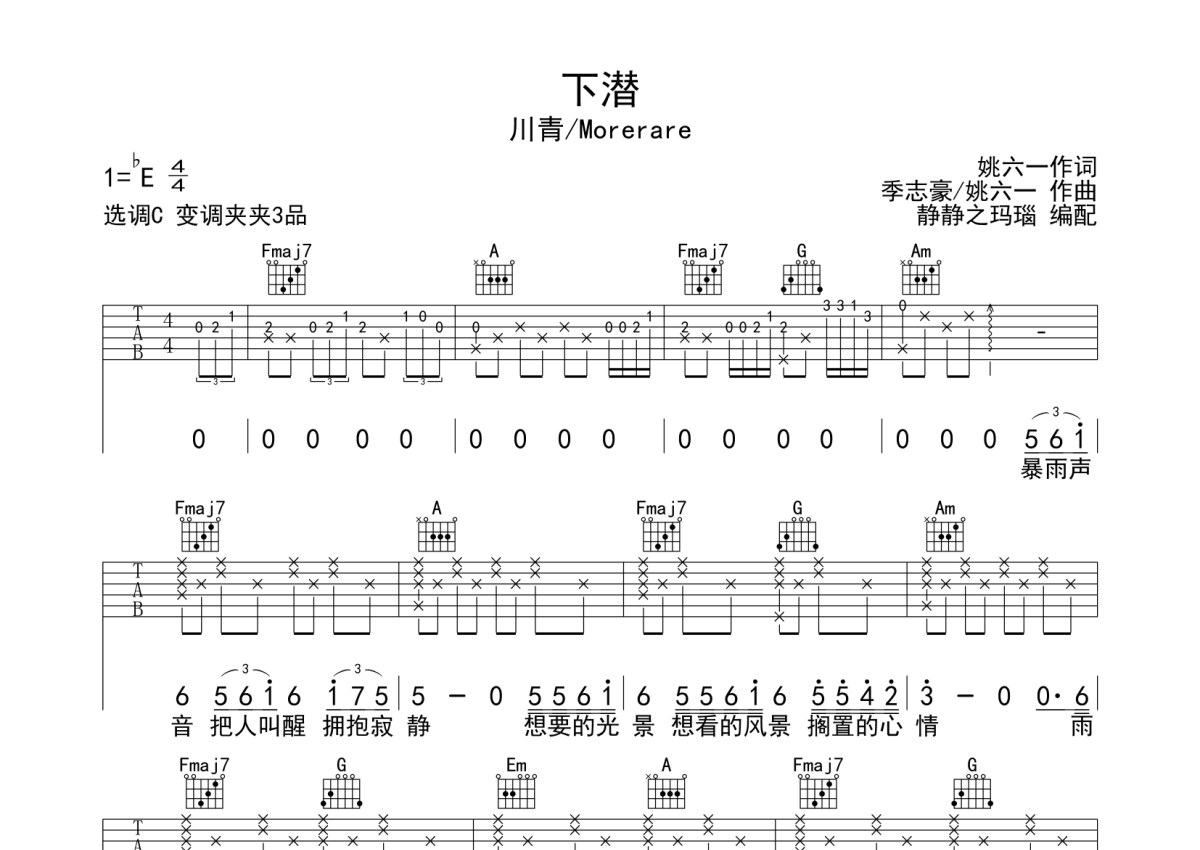 川青/Morerare《下潜》吉他谱 - C调弹唱六线谱