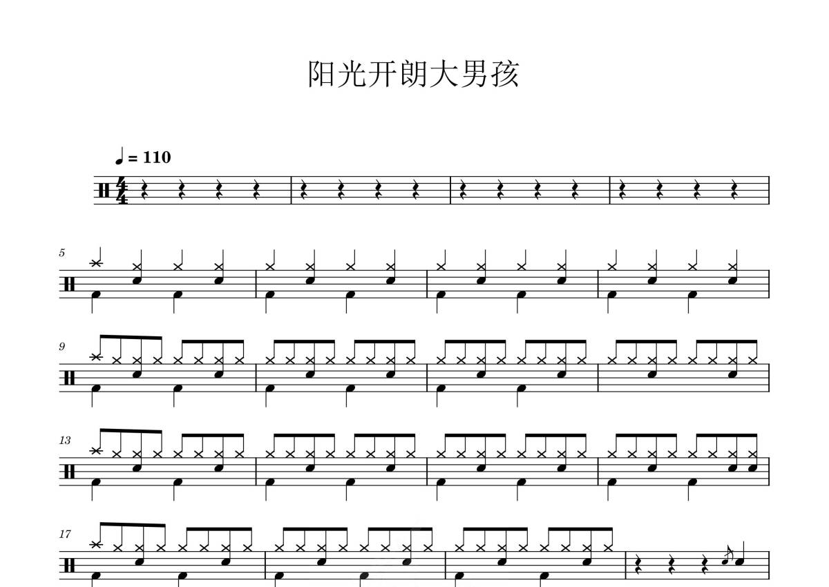 《阳光开朗大男孩》是卦者灵风演唱的一首歌曲,真不难版,拍号为4/4拍,歌曲速度为每分钟110拍,这份鼓谱共有两张高清图谱,图谱由 @打鼓谱 编配上传,图谱使用五线谱编配,使用这份阳光开朗大男孩架子鼓谱,你将能够轻松地敲打出这首卦者灵风的阳光开朗大男孩,快来尝试吧。