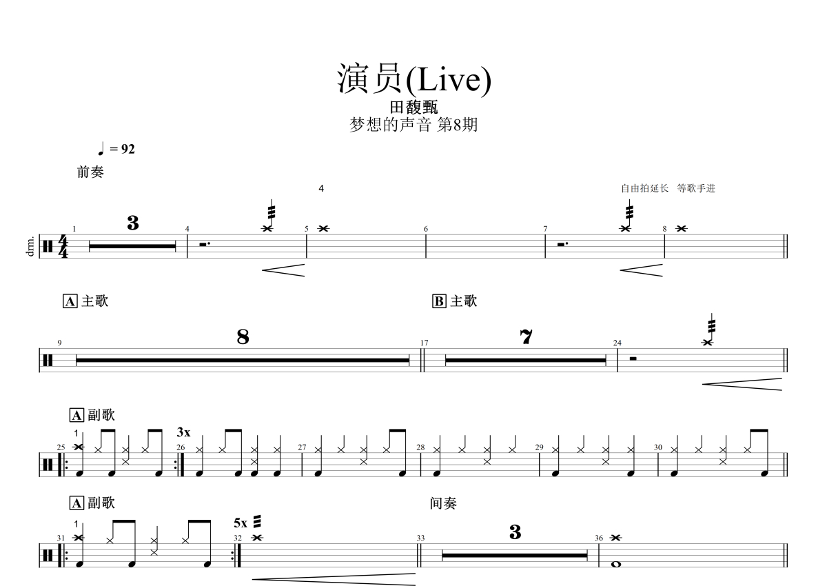 田馥甄《演员》鼓谱 - 架子鼓谱 - live