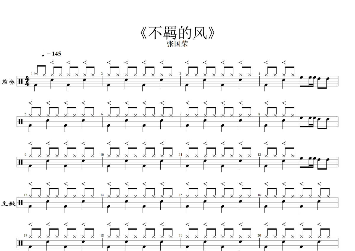 《不羁的风》是张国荣演唱的一首歌曲,拍号为4/4拍,歌曲速度为每分钟145拍,这份鼓谱共有两张高清图谱,图谱由 @打鼓谱 编配上传,图谱使用五线谱编配,使用这份不羁的风架子鼓谱,你将能够轻松地敲打出这首张国荣的不羁的风,快来尝试吧。《不羁的风》是张国荣演唱的歌曲,由林振强作词,大沢誉志幸作曲,收录于张国荣1985年5月14日发行的专辑《为你钟情》[10]。1986年,该曲在第3届十大劲歌金曲颁奖典礼上获得十大劲歌金曲奖[6]。