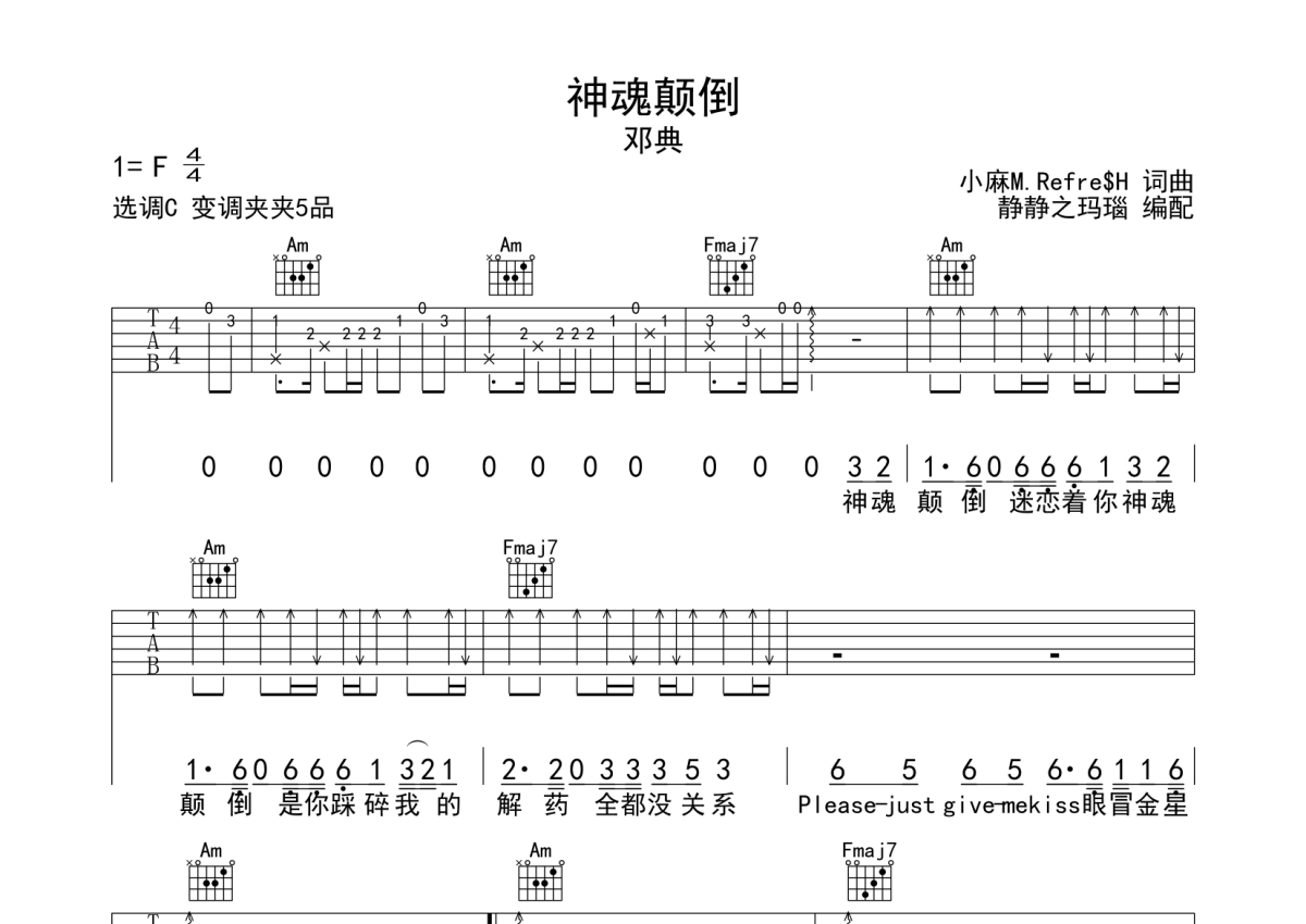《神魂颠倒》是邓典演唱的一首歌曲,本吉他谱采用的是C调指法编配,这份吉他谱共有三张高清图谱,图谱由 @静待花开 编配上传,图谱使用六线谱编配,包含吉他和弦指法、简谱以及歌词部分,使用这份神魂颠倒吉他谱,可以让你更加方便地掌握这首歌曲的弹唱技巧,快来尝试吧。神魂颠倒C调吉他谱。