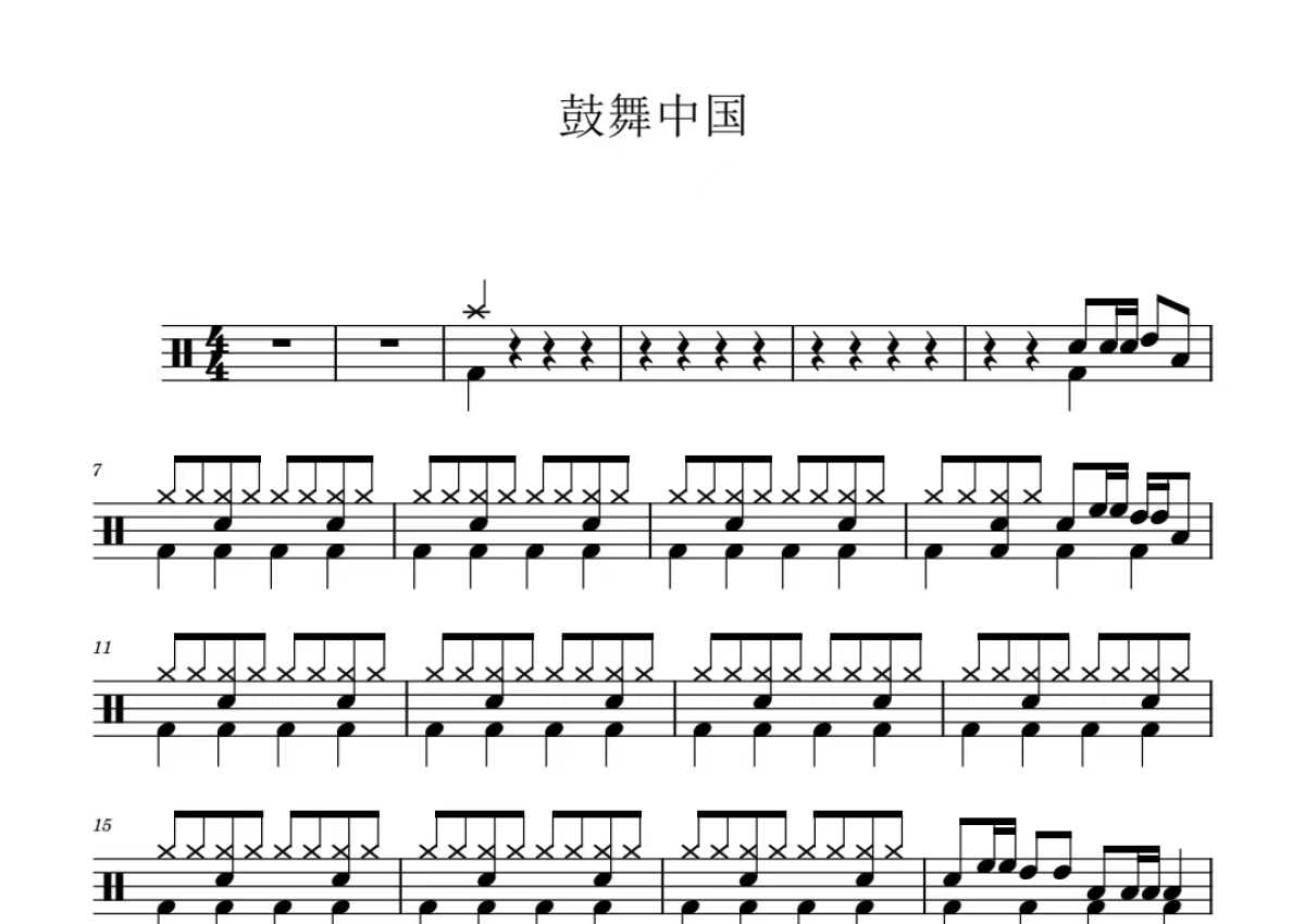 《鼓舞中国》是纯音乐演唱的一首歌曲,拍号为4/4拍,这份鼓谱共有三张高清图谱,图谱由 @打鼓谱 编配上传,图谱使用五线谱编配,使用这份鼓舞中国架子鼓谱,你将能够轻松地敲打出这首纯音乐的鼓舞中国,快来尝试吧。鼓舞中国。