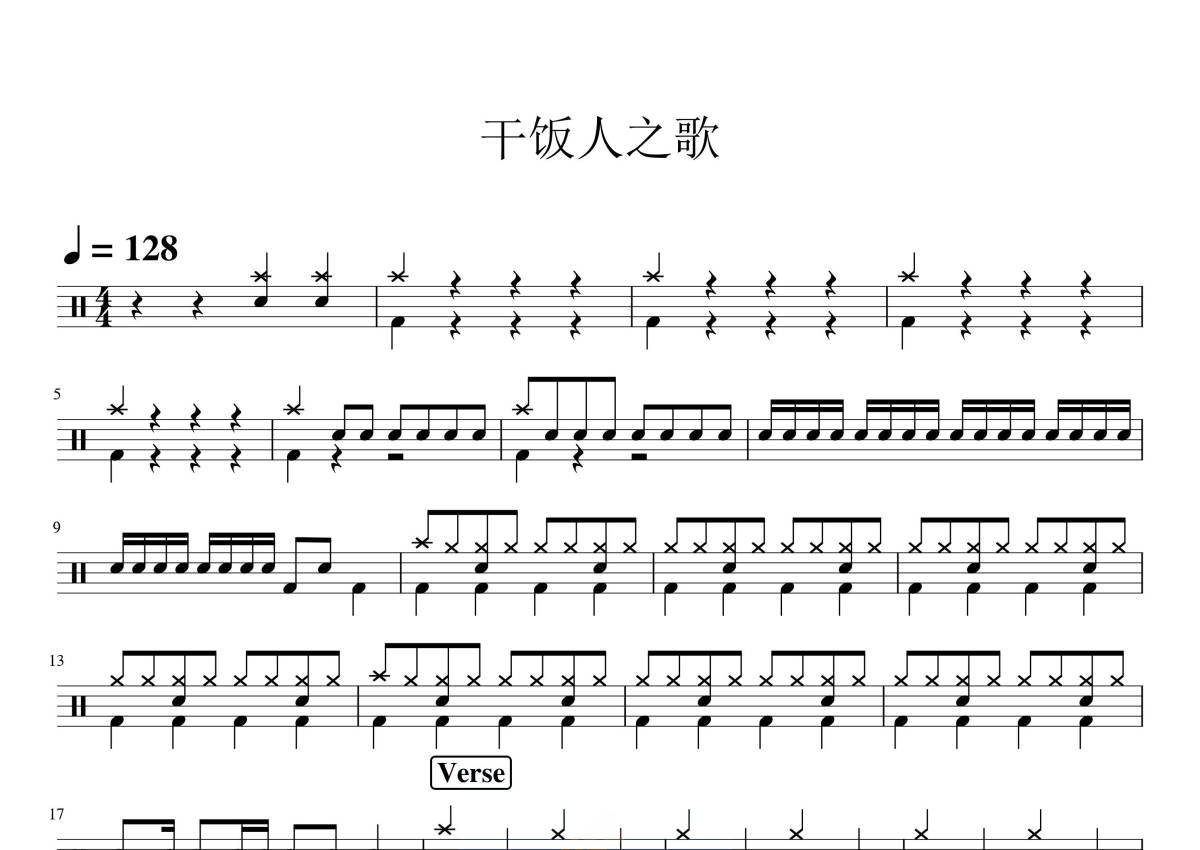 《干饭人之歌》是张老板啊演唱的一首歌曲,拍号为4/4拍,歌曲速度为每分钟128拍,这份鼓谱共有三张高清图谱,图谱由 @打鼓谱 编配上传,图谱使用五线谱编配,使用这份干饭人之歌架子鼓谱,你将能够轻松地敲打出这首张老板啊的干饭人之歌,快来尝试吧。无。