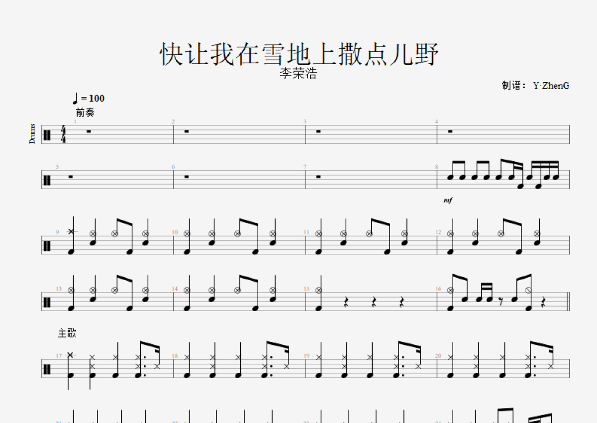 李荣浩《快让我在这雪地上撒点野》鼓谱 - 架子鼓谱 - 精扒版