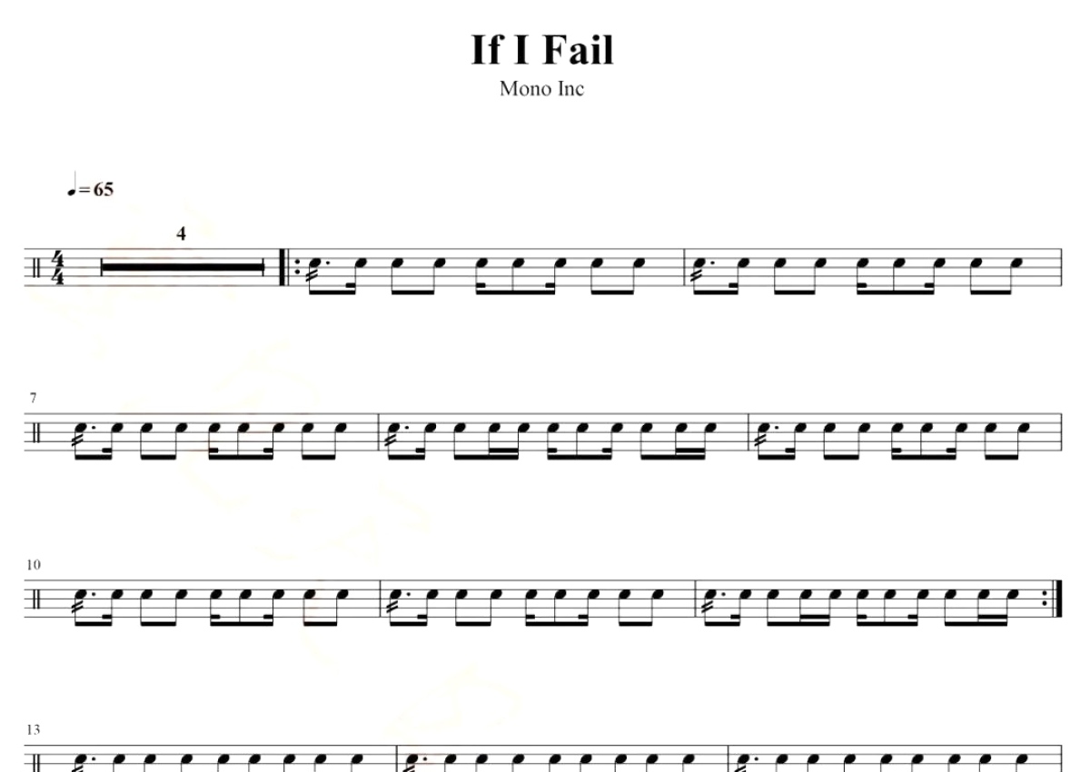 《f I Fail》是Mono Inc.演唱的一首歌曲,歌曲速度为每分钟65拍,这份鼓谱共有四张高清图谱,图谱由 @打鼓谱 编配上传,图谱使用五线谱编配,使用这份f I Fail架子鼓谱,你将能够轻松地敲打出这首Mono Inc.的f I Fail,快来尝试吧。Mono Inc. - If I Fail。