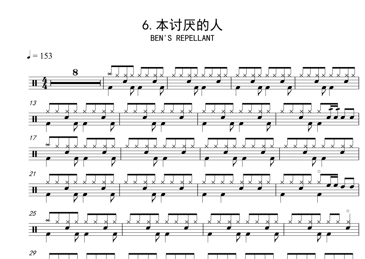 《本讨厌的人》是上海打击乐3-6演唱的一首歌曲,歌曲速度为每分钟153拍,这份鼓谱共有四张高清图谱,图谱由 @打鼓谱 编配上传,图谱使用五线谱编配,使用这份本讨厌的人架子鼓谱,你将能够轻松地敲打出这首上海打击乐3-6的本讨厌的人,快来尝试吧。超高清鼓谱,根据上海打击乐编制,合适比赛的歌曲。
