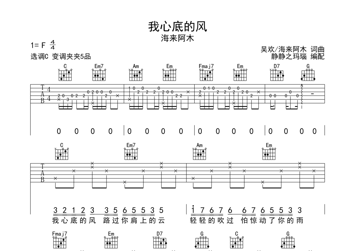 海来阿木《我心底的风》吉他谱 - C调弹唱六线谱