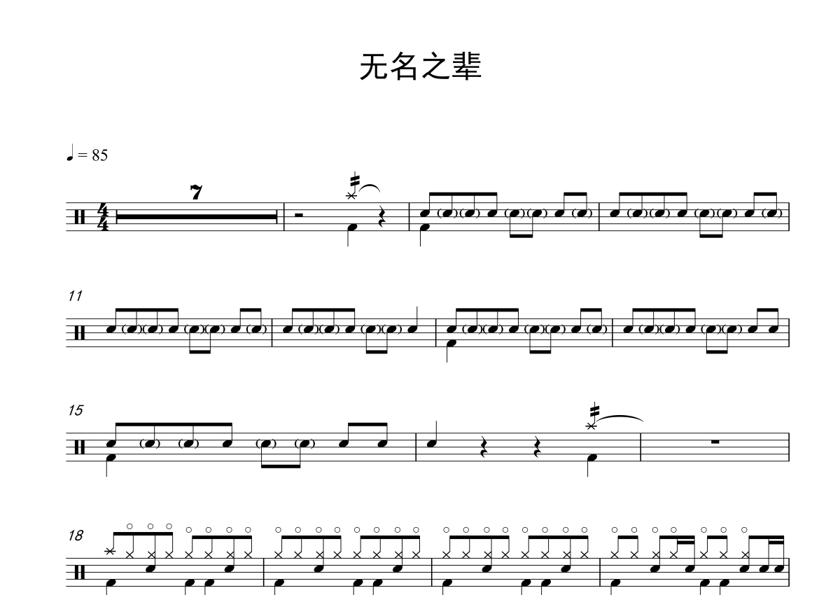 《无名之辈》是陈雪燃演唱的一首歌曲,歌曲速度为每分钟85拍,这份鼓谱共有两张高清图谱,图谱由 @打鼓谱 编配上传,图谱使用五线谱编配,使用这份无名之辈架子鼓谱,你将能够轻松地敲打出这首陈雪燃的无名之辈,快来尝试吧。《无名之辈》是电影《无名之辈》的同名主题曲,由陈嬛、汪苏泷作曲,汪苏泷演唱的一首歌曲,这首歌曲在编曲上也非常有特点,层层递进。 前奏由一声镲和弦乐的颤弓引入,主歌部分开始由pad和管弦乐作为伴奏,后来进入了鼓的loop;连接部分弦乐的演奏法有连弓变为跳弓与顿弓;副歌的hi hat非常有特点,用三连音的律动打破原本节奏,使歌曲节奏变得更加有特点。
