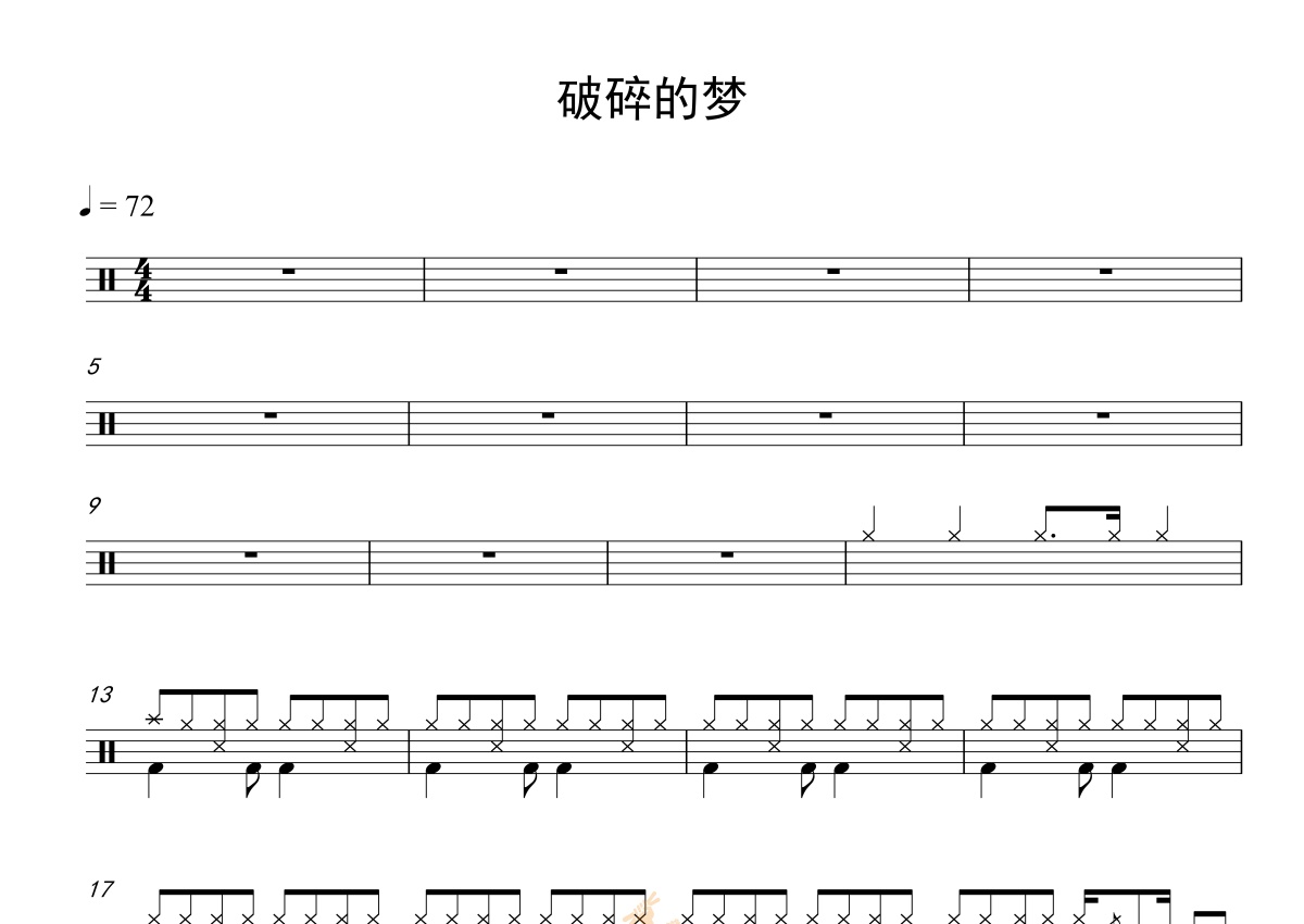 《破碎的梦》是广东吴勇演唱的一首歌曲,拍号为4/4拍,歌曲速度为每分钟72拍,这份鼓谱共有两张高清图谱,图谱由 @打鼓谱 编配上传,图谱使用五线谱编配,使用这份破碎的梦架子鼓谱,你将能够轻松地敲打出这首广东吴勇的破碎的梦,快来尝试吧。《破碎的梦》原唱是广东吴勇。歌曲《破碎的梦》由电白小七作词,由谢文夕作曲,由网红歌手广东吴勇进行演唱。该歌曲在网上一经首发,即受到全国网友的广泛关注和喜爱,并在网上广为流传。 (共2页)本人是开鼓校的,非常合适集体课的教学,让学生一节课就能掌握。
