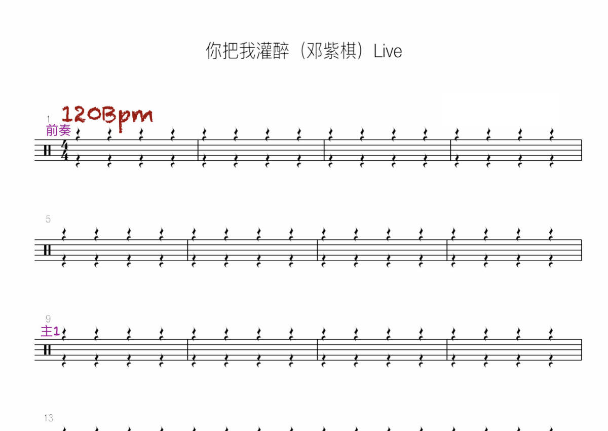 《你把我灌醉》是邓紫棋演唱的一首歌曲,Live,拍号为4/4拍,歌曲速度为每分钟120拍,这份鼓谱共有五张高清图谱,图谱由 @打鼓谱 编配上传,图谱使用五线谱编配,使用这份你把我灌醉架子鼓谱,你将能够轻松地敲打出这首邓紫棋的你把我灌醉,快来尝试吧。《你把我灌醉》是邓紫棋改编并演唱的歌曲,原唱为黄大炜,由姚若龙填词,黄大炜谱曲,后收录在邓紫棋2013年发行的首张精选专辑《The Best of G.E.M. 2008-2012》中。