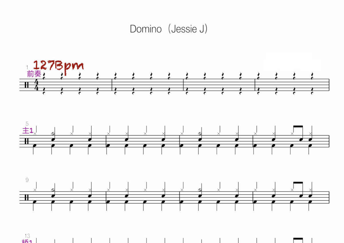 《Domino》是Jessie J演唱的一首歌曲,拍号为4/4拍,歌曲速度为每分钟127拍,这份鼓谱共有四张高清图谱,图谱由 @打鼓谱 编配上传,图谱使用五线谱编配,使用这份Domino架子鼓谱,你将能够轻松地敲打出这首Jessie J的Domino,快来尝试吧。《Domino》是Jessie J演唱的一首歌曲,词曲由Jessie J、Dr.Luke、克劳德·凯利、马克斯·马丁和亨利·沃尔特编写,由Dr.Luke和Cirkut制作,收录于Jessie J的首张录音室专辑《Who You Are》中,并作为推广专辑的第五支单曲于2011年8月29日通过环球唱片公司发行。