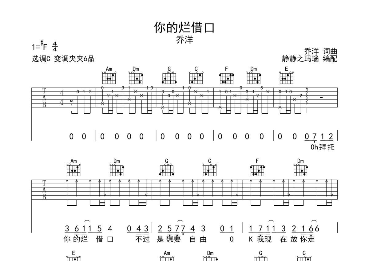 乔洋《你的烂借口》吉他谱 - C调弹唱六线谱