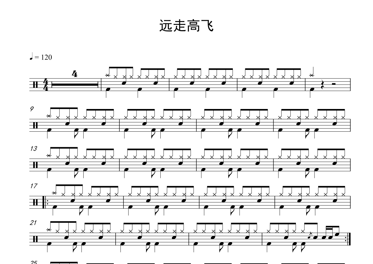 《远走高飞》是金志文演唱的一首歌曲,拍号为4/4拍,歌曲速度为每分钟120拍,这份鼓谱共有两张高清图谱,图谱由 @打鼓谱 编配上传,图谱使用五线谱编配,使用这份远走高飞架子鼓谱,你将能够轻松地敲打出这首金志文的远走高飞,快来尝试吧。《远走高飞》是由王耀光作词,金志文作曲并演唱的一首歌曲,收录于金志文2017年发行的专辑《Hello 1》中,是网络剧《北京女子图鉴》中的插曲。 2021年12月25日,该曲获得2021年度全球中文音乐榜上榜原创之夜优秀原创作品的奖项。 (共2页)本人是开鼓校的,非常合适集体课的教学,让学生一节课就能掌握。