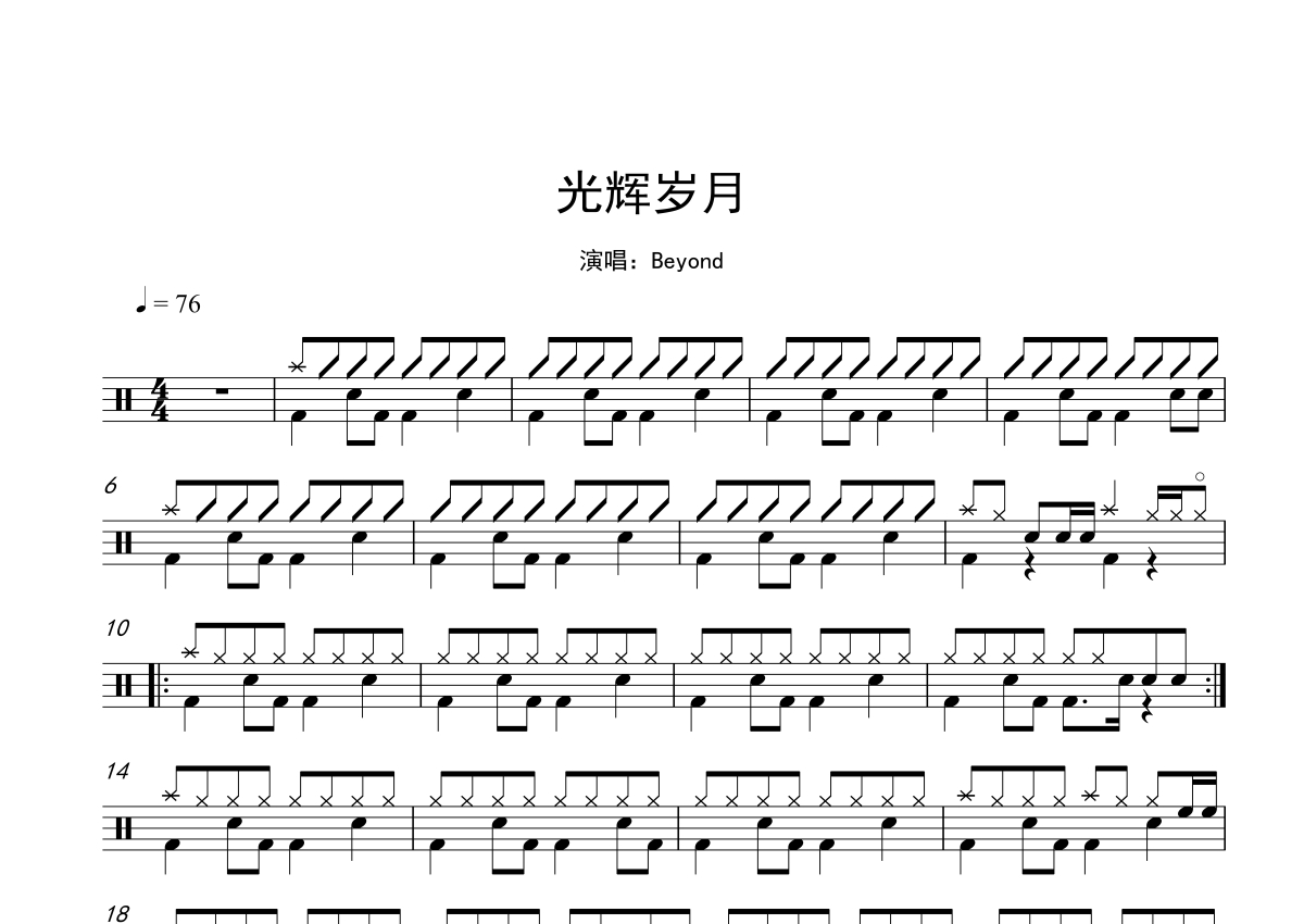 《光辉岁月》是Beyond演唱的一首歌曲,拍号为4/4拍,歌曲速度为每分钟76拍,这份鼓谱共有两张高清图谱,图谱由 @打鼓谱 编配上传,图谱使用五线谱编配,使用这份光辉岁月架子鼓谱,你将能够轻松地敲打出这首Beyond的光辉岁月,快来尝试吧。《光辉岁月》是由华特·迪士尼影片公司2001年03月30日在西班牙发行的一部故事片。 该片由Boaz Yakin执导, 丹泽尔·华盛顿 等人主演。 该片讲述的是由于学校合并,在种族歧视气氛很重的情况下,黑人教练出任橄榄球总教练,在面对内忧外患的情况下,依然带领着球队取得胜利的故事。(共2页)本人是开鼓校的,非常合适集体课的教学,让学生一节课就能掌握。