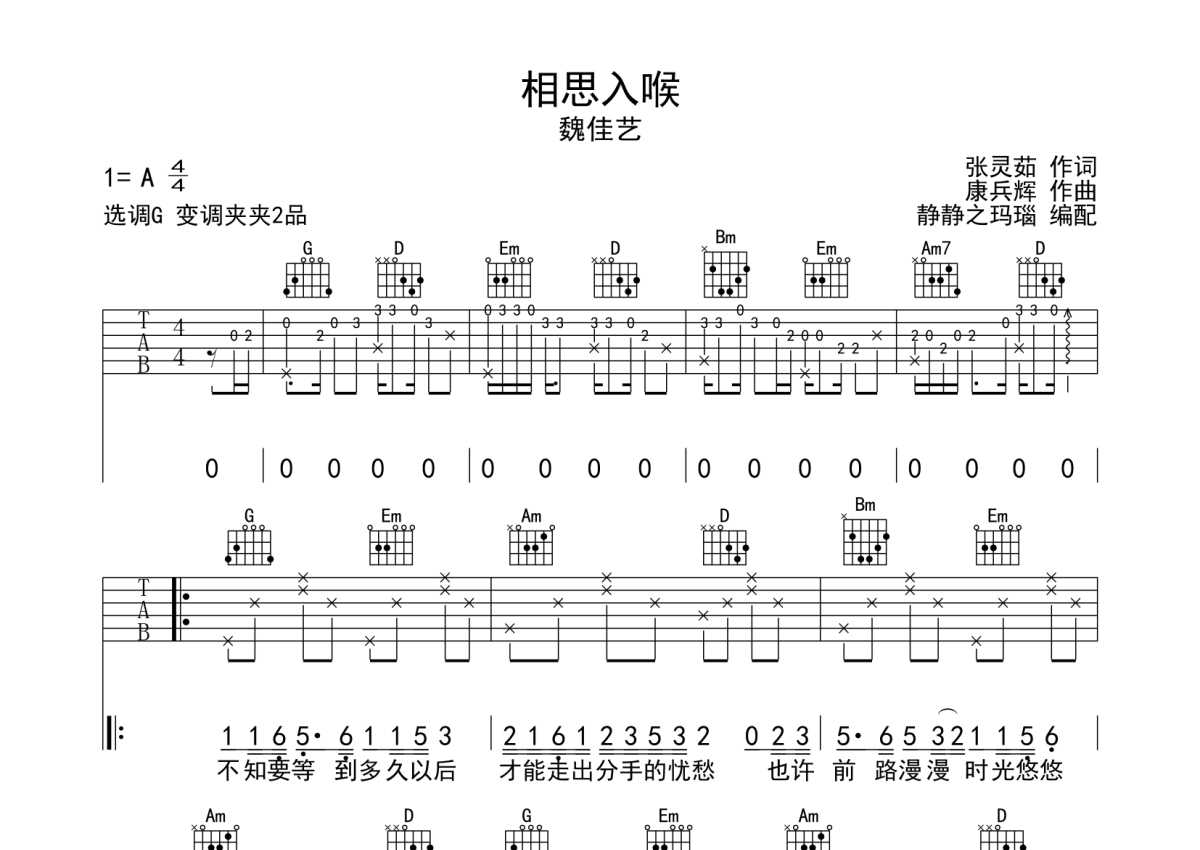 魏佳艺《相思入喉》吉他谱 - G调弹唱六线谱
