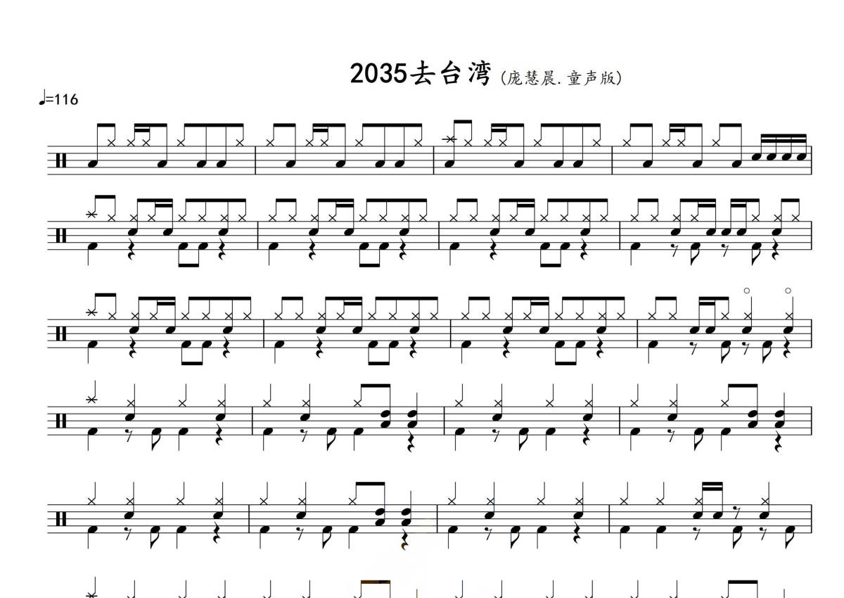 《2035去台湾》是孟煦东/庞惠晨演唱的一首歌曲,拍号为3/4拍,歌曲速度为每分钟116拍,这份鼓谱共有两张高清图谱,图谱由 @打鼓谱 编配上传,图谱使用五线谱编配,使用这份2035去台湾架子鼓谱,你将能够轻松地敲打出这首孟煦东/庞惠晨的2035去台湾,快来尝试吧。