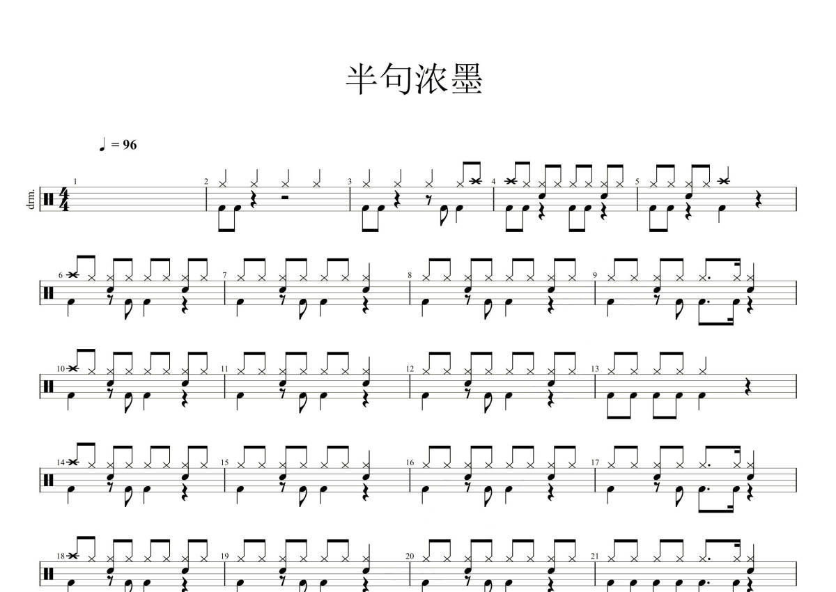 《半句浓墨》是零一九零贰演唱的一首歌曲,拍号为4/4拍,歌曲速度为每分钟96拍,这份鼓谱共有两张高清图谱,图谱由 @打鼓谱 编配上传,图谱使用五线谱编配,使用这份半句浓墨架子鼓谱,你将能够轻松地敲打出这首零一九零贰的半句浓墨,快来尝试吧。半句浓墨 - 零一九零贰。