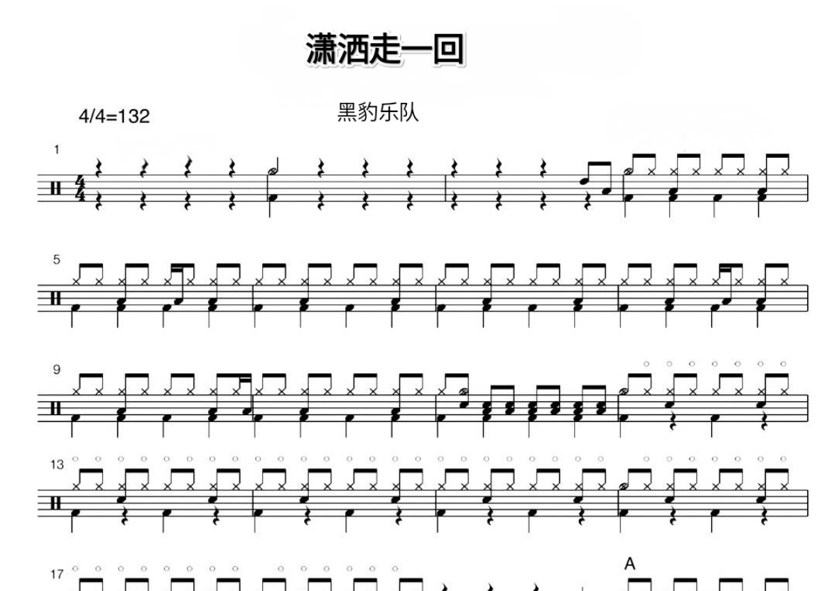 《潇洒走一回》是黑豹乐队演唱的一首歌曲,拍号为4/4拍,歌曲速度为每分钟132拍,这份鼓谱共有三张高清图谱,图谱由 @打鼓谱 编配上传,图谱使用五线谱编配,使用这份潇洒走一回架子鼓谱,你将能够轻松地敲打出这首黑豹乐队的潇洒走一回,快来尝试吧。黑豹乐队《潇洒走一回》我为歌狂第二季第六期。