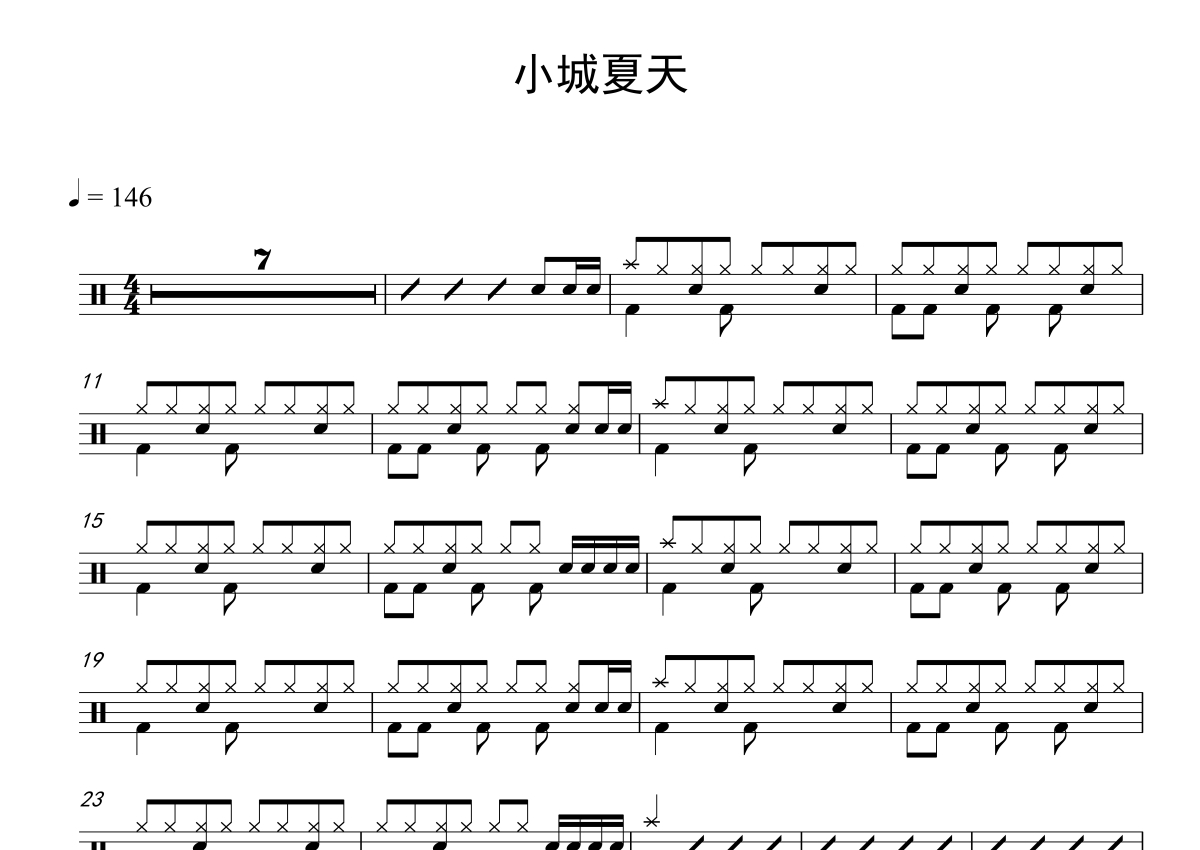 《小城夏天》是LBI利比演唱的一首歌曲,拍号为4/4拍,歌曲速度为每分钟146拍,这份鼓谱共有两张高清图谱,图谱由 @打鼓谱 编配上传,图谱使用五线谱编配,使用这份小城夏天架子鼓谱,你将能够轻松地敲打出这首LBI利比的小城夏天,快来尝试吧。《小城夏天》是LBI利比演唱的歌曲,由陶旧作词,盛骁作曲,WayMen歪门、KENNY妮妮编曲,于2022年04月02日发行,收录于同名专辑《小城夏天》,(共2页)本人是开鼓校的,非常合适集体课的教学,让学生一节课就能掌握。