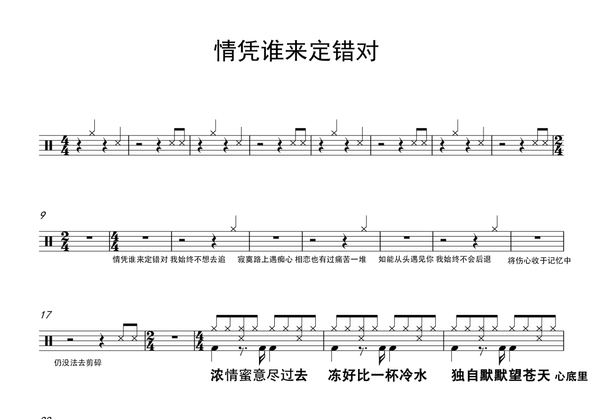 《情凭谁来定错对》是谭咏麟演唱的一首歌曲,这份鼓谱共有两张高清图谱,图谱由 @打鼓谱 编配上传,图谱使用五线谱编配,使用这份情凭谁来定错对架子鼓谱,你将能够轻松地敲打出这首谭咏麟的情凭谁来定错对,快来尝试吧。《情凭谁来定错对》是谭咏麟演唱的粤语歌曲,由谭咏麟作词,金贤植作曲,卢东尼编曲,收录在谭咏麟1994年2月8日发行的粤语专辑《梦幻的笑容》中。