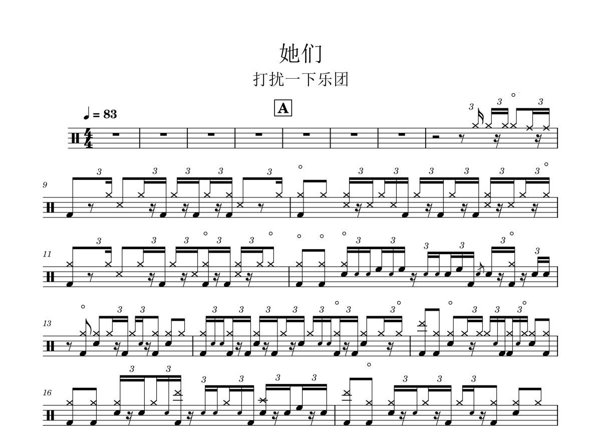 《她们》是打扰一下乐团演唱的一首歌曲,歌曲速度为每分钟83拍,这份鼓谱共有三张高清图谱,图谱由 @打鼓谱 编配上传,图谱使用五线谱编配,使用这份她们架子鼓谱,你将能够轻松地敲打出这首打扰一下乐团的她们,快来尝试吧。