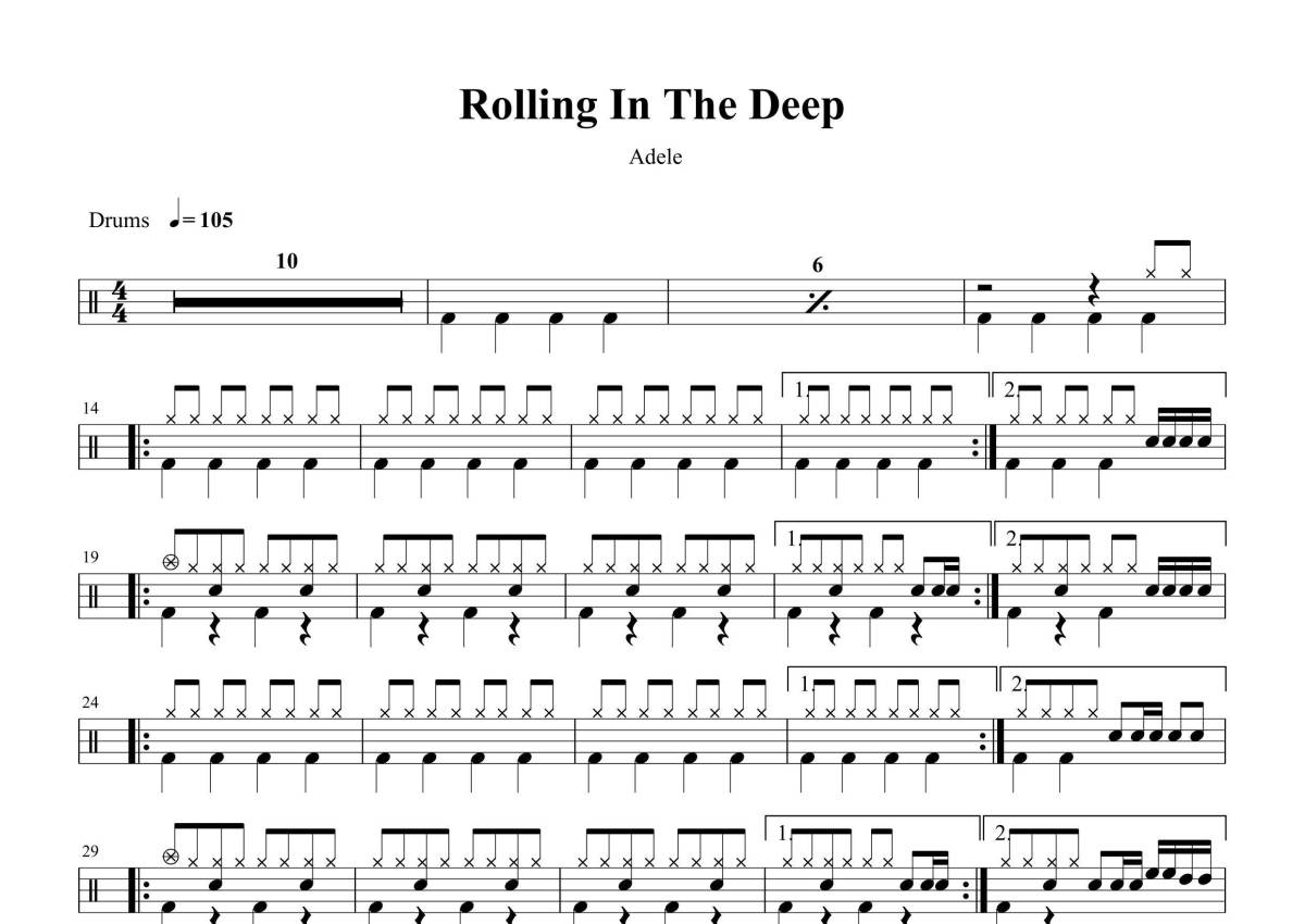 《Rolling In The Deep》是阿黛尔·阿德金斯演唱的一首歌曲,这份鼓谱共有两张高清图谱,图谱由 @打鼓谱 编配上传,图谱使用五线谱编配,使用这份Rolling In The Deep架子鼓谱,你将能够轻松地敲打出这首阿黛尔·阿德金斯的Rolling In The Deep,快来尝试吧。《Rolling in the Deep》是阿黛尔·阿德金斯演唱的一首歌曲,词曲由阿黛尔·阿德金斯和保罗·伊普沃斯创作,音乐制作由保罗·艾普沃斯负责,于2010年11月29日通过XL唱片公司发行。 鼓谱简单易懂。