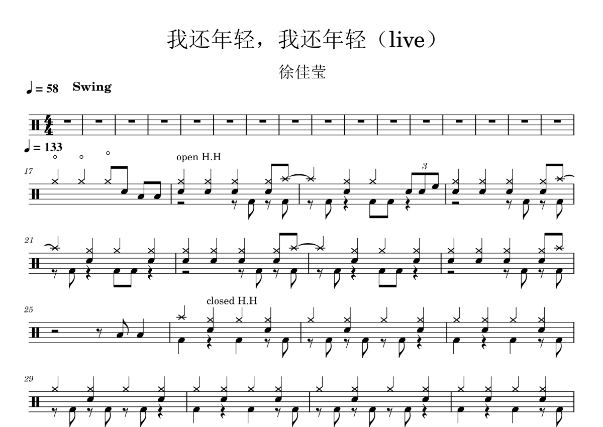 《我还年轻》是徐佳莹演唱的一首歌曲,live,这份鼓谱共有三张高清图谱,图谱由 @打鼓谱 编配上传,图谱使用五线谱编配,使用这份我还年轻架子鼓谱,你将能够轻松地敲打出这首徐佳莹的我还年轻,快来尝试吧。
