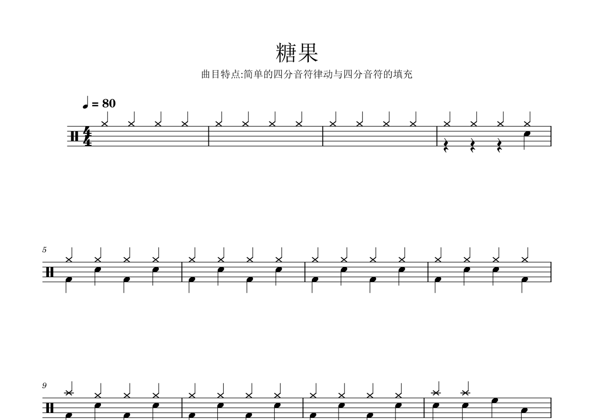 《糖果》是迷笛预备级演唱的一首歌曲,歌曲速度为每分钟80拍,这份鼓谱共有一张高清图谱,图谱由 @打鼓谱 编配上传,图谱使用五线谱编配,使用这份糖果架子鼓谱,你将能够轻松地敲打出这首迷笛预备级的糖果,快来尝试吧。曲目说明:《糖果》是一首流行(Pop)风格的乐曲,以简单的四分音符律动与四分音符填充为主,要注意乐曲的速度 以及与其他乐器的配合。四分音符的军鼓与吊镲的配合要注意同时击打的时值和力度。