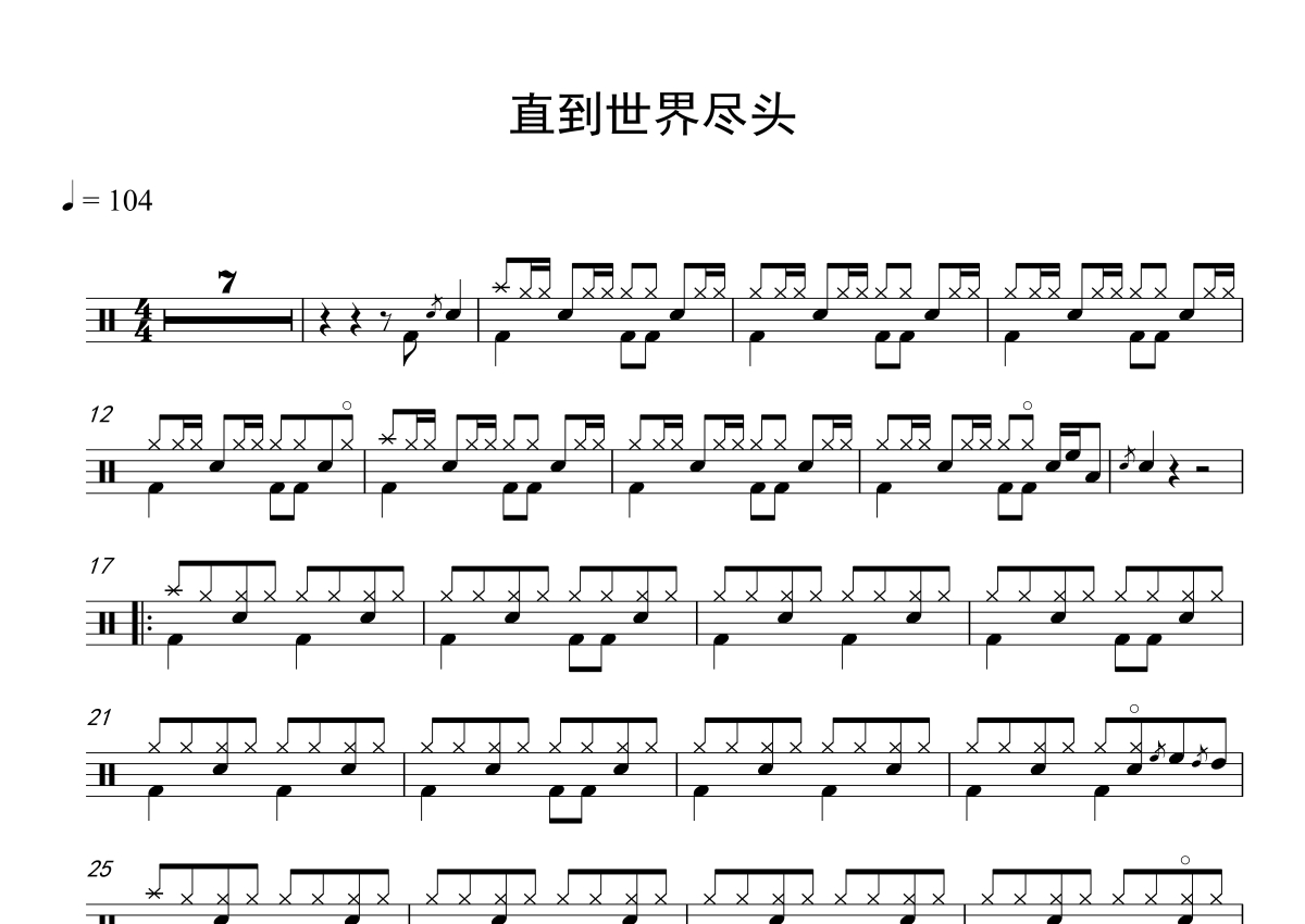 《直到世界尽头》是灌篮高手演唱的一首歌曲,这份鼓谱共有两张高清图谱,图谱由 @打鼓谱 编配上传,图谱使用五线谱编配,使用这份直到世界尽头架子鼓谱,你将能够轻松地敲打出这首灌篮高手的直到世界尽头,快来尝试吧。《直到世界尽头》是果味VC演唱的歌曲,由孙凌生、杨林作词,孙凌生作曲,收录于2013年发行的音乐专辑《启示录》。2014年,该曲获得第3届阿比鹿音乐奖“年度摇滚单曲奖”。
