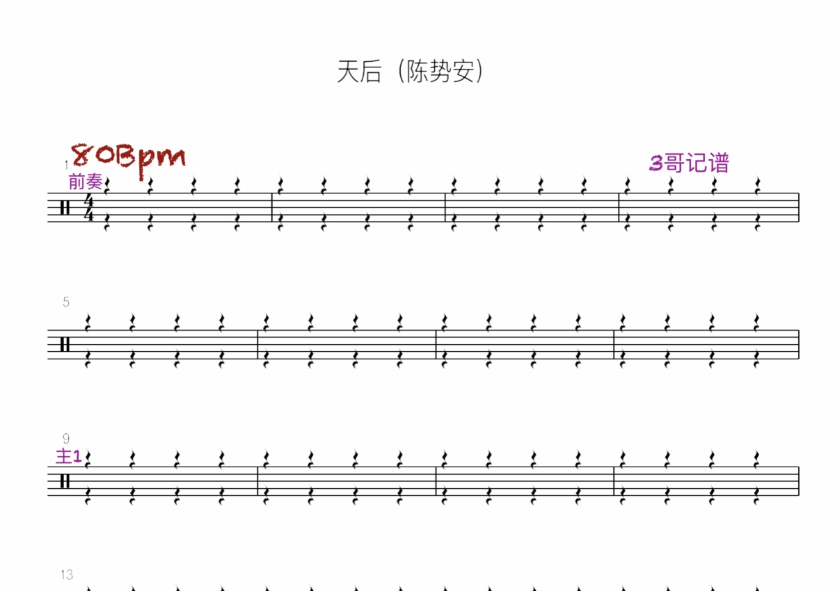 《天后》是陈势安演唱的一首歌曲,这份鼓谱共有四张高清图谱,图谱由 @打鼓谱 编配上传,图谱使用五线谱编配,使用这份天后架子鼓谱,你将能够轻松地敲打出这首陈势安的天后,快来尝试吧。《天后》是歌手陈势安演唱的歌曲,由彭学斌填词和谱曲 ,收录于陈势安2009年同名专辑《天后》 2010年11月22日这首歌获马来西亚娱协奖“娱协十大金曲”。