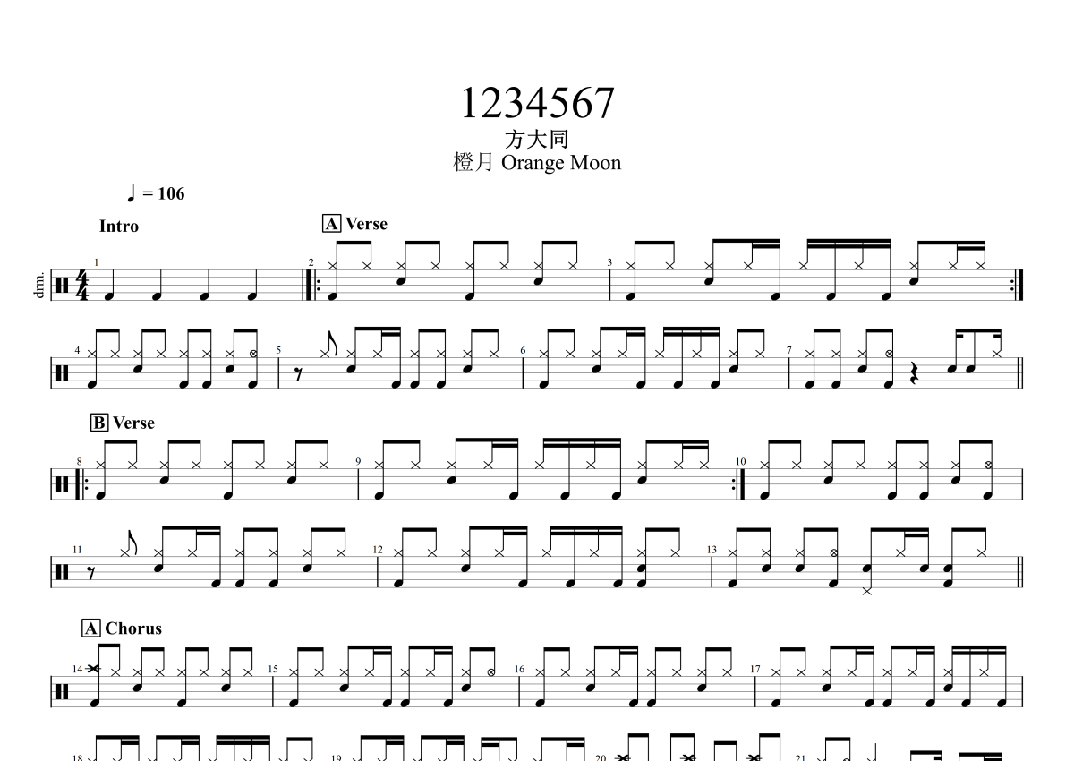 《1234567》是方大同演唱的一首歌曲,这份鼓谱共有两张高清图谱,图谱由 @打鼓谱 编配上传,图谱使用五线谱编配,使用这份1234567架子鼓谱,你将能够轻松地敲打出这首方大同的1234567,快来尝试吧。