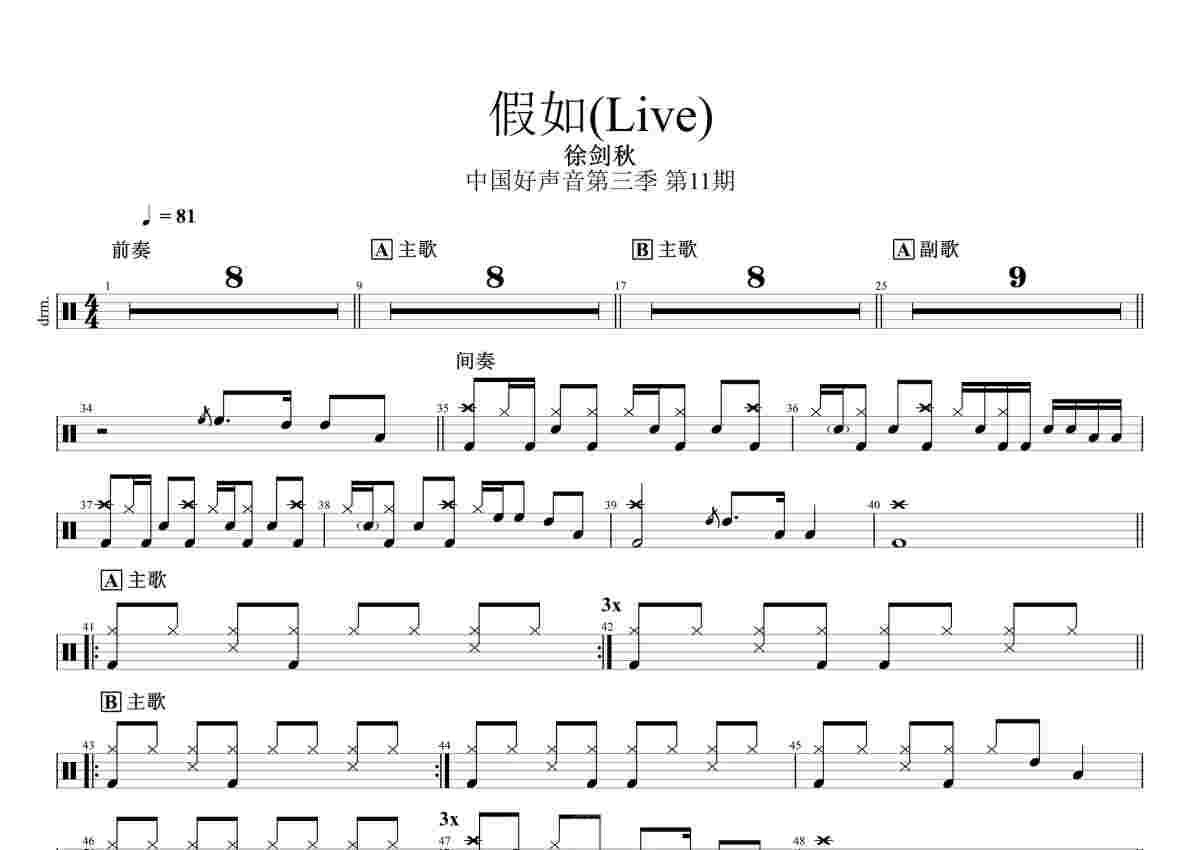徐剑秋《假如》鼓谱 - 架子鼓谱 - 中国好声音Live版