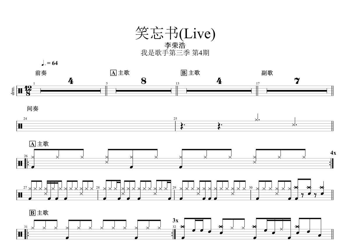 李荣浩《笑忘书》鼓谱 - 架子鼓谱 - 我是歌手Live版