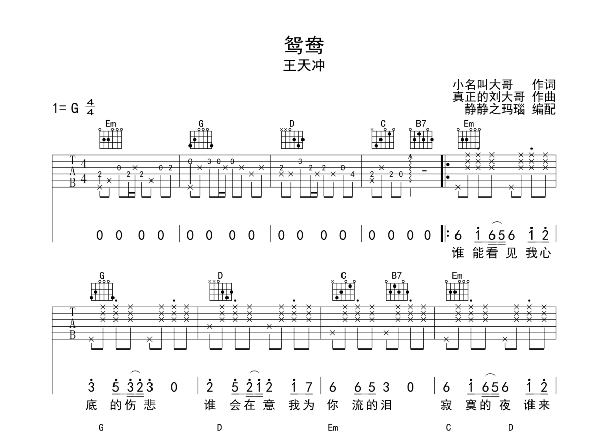 王天冲《鸳鸯》吉他谱 - G调弹唱六线谱