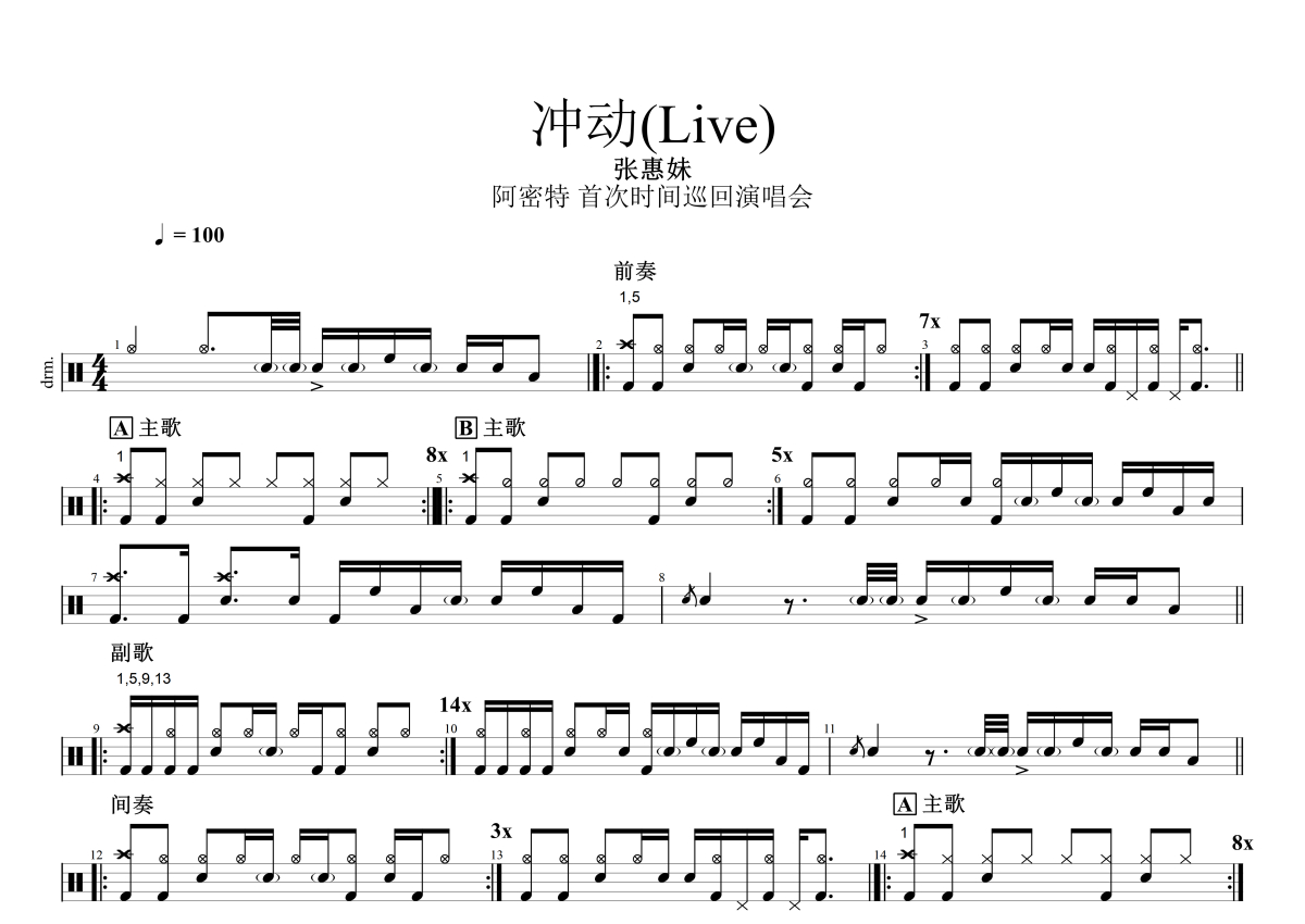 张惠妹《冲动》鼓谱 - 架子鼓谱 - Live版