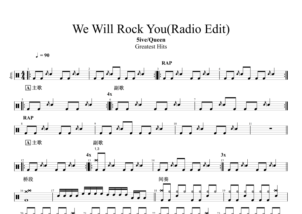 5ive/Queen《We Will Rock You(Radio Edit)》鼓谱 - 架子鼓谱